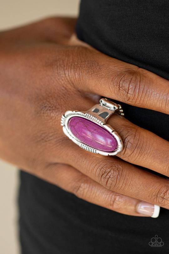 An oblong purple stone is pressed into the center of an ornate silver frame for a seasonal look. Features a stretchy band for a flexible fit.