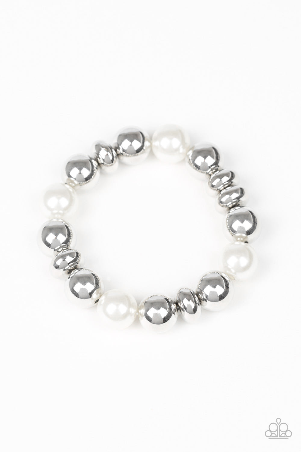 A collection of shiny silver beads and pearly white beads are threaded along a stretchy band around the wrist for a refined look.